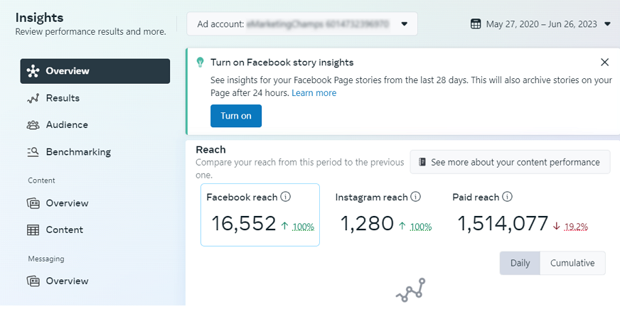 And a secondary source of traffic was Facebook Ads, achieving sizable followers, reach and sales: